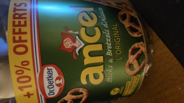 A container of "ancel Sticks & Bretzels d'Alsace L'ORIGINAL" by Dr
