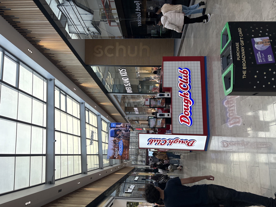 The image depicts an interior view of a pedestrian corridor within The Broadway shopping centre, Bradford, United Kingdom. The perspective looks down a wide, light-tiled walkway with a reflective surface. In the midground, a prominent 'Dough Club' kiosk features white and red paneling with a blue grid trim and an illuminated 'Dough Club' logo. Three digital screens on the kiosk display 'Order Here'. Multiple individuals are present. A male with dark, curly hair, wearing a dark t-shirt and trousers, walks away from the camera in the left foreground. Two males walk away from the camera in the right midground; one wears a light puffer jacket, the other a light top and jeans. Additional blurred pedestrians are visible in the distance. Retail establishments line both sides of the corridor. Visible signage on the right includes 'River Island KIDS', 'schuh' (vertical), and a partial 'Foot Locker' logo. A 'Foot Locker' sign is also visible on the left side. Store facades feature large glass windows. Overhead, a high, glass-panelled skylight with visible metal support beams provides natural light. The ceiling structure incorporates recessed lighting. A large horizontal digital display screen in the upper midground shows a message, 'Zakat is our Sacred duty', accompanied by an image. Upper store walls are clad with vertical wooden slats. In the right foreground, a black three-compartment recycling bin with green lids displays branding for 'THE BROADWAY GIFT CARD' and 'BRADFORD CITY CENTRE BID'.