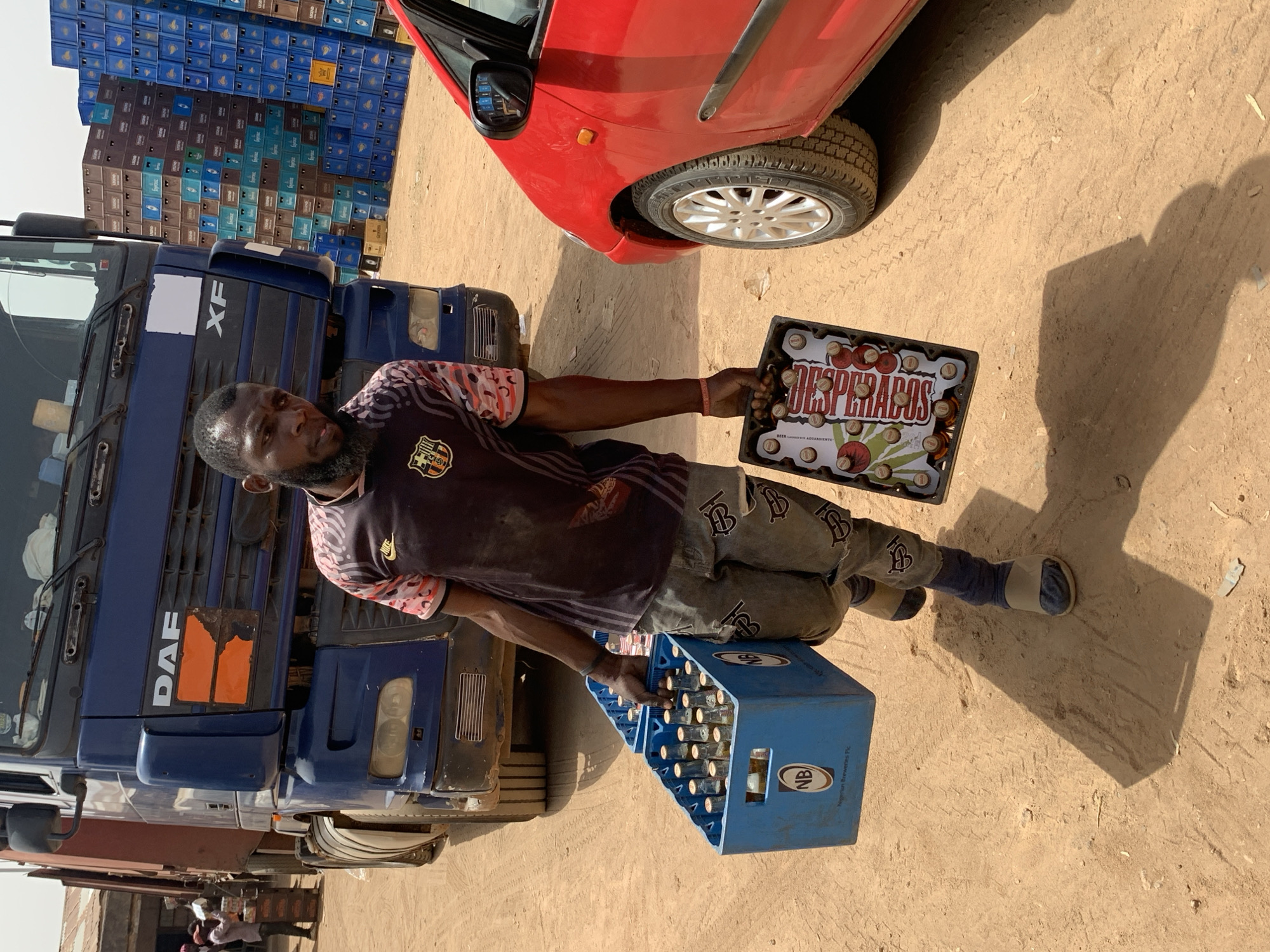 The image captures an outdoor commercial distribution scene in Bukuru, Nigeria, under bright daylight. A dark-complexioned adult male with a beard, wearing a dark short-sleeved t-shirt with an emblem and patterned sleeves, light-colored jeans adorned with repeated 'B' logos, and sandals, walks from the viewer's right to left across unpaved, dusty ground. He carries a blue plastic crate filled with bottled beverages, marked "NB" (Nigerian Breweries Plc), in his left arm. Simultaneously, he holds a black plastic tray containing bottled "DESPERADOS" beverages in his right hand. His shadow is prominently cast on the ground to his left. In the immediate background, a large dark blue DAF XF semi-truck is partially visible on the left, displaying its front grille and headlights. To the man's right, the front portion of a red car, including its passenger-side wheel and side mirror, is visible. The background features towering, organized stacks of various colored beverage crates (primarily blue and brown), some clearly marked "LEGEND" and "Guinness," indicating a significant storage or wholesale operation. In the far left background, another individual is faintly visible near a simple building with a corrugated metal roof. The sky overhead is light and hazy.