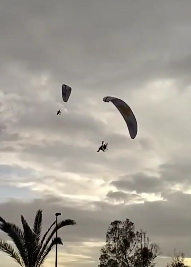 two paragliders flying in the sky. One paraglider is a light gray color, while the other is a dark gray color. They are flying relatively close to each other. The background features a cloudy sky with a few patches of blue and palm trees with cars parked beneath them. The video is taken from ground level and there are other people around the camera.