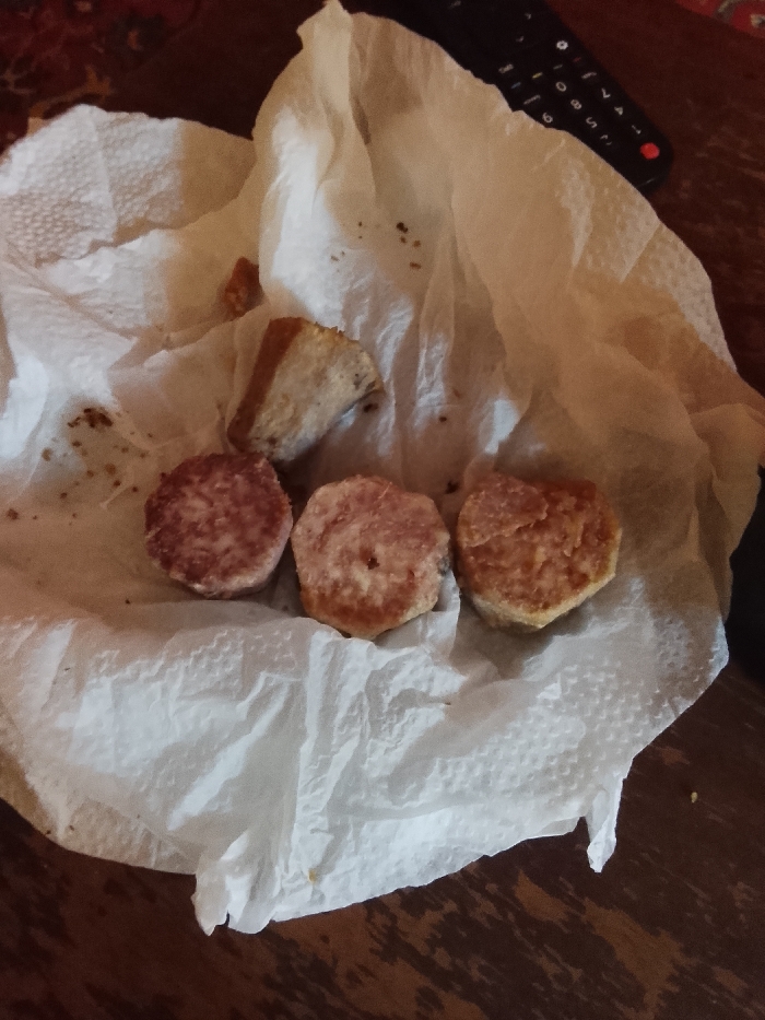This image depicts a close-up, high-angle view of food items resting on a crumpled white paper towel. The scene is located in Kiambu Township ward, Kenya. **Subjects/Objects:** - **Food:** Three roughly circular, cooked meat patties, likely slices of sausage or similar processed meat, are arranged on the paper towel. The patty on the left is reddish-brown with visible texture, while the two on the right are lighter brown/tan with some browning on the edges. One irregularly shaped piece of toasted bread or cake, light brown with darker edges, is positioned above and to the left of the patties. Small dark crumbs are scattered on the paper towel. - **Paper Towel:** A single sheet of white, textured paper towel is significantly crumpled and serves as a base for the food, suggesting it is absorbing excess oil. - **Background:** The paper towel and food items rest on a dark brown surface, possibly wood, exhibiting grain patterns. In the upper right corner, a portion of a black television remote control with white numerical and function buttons is visible. **Actions/Interactions:** The food items are static, resting on the paper towel. There are no people visible, and no active interactions are depicted. **Environment:** The setting appears to be an indoor domestic environment, possibly a kitchen or dining area, given the presence of cooked food and a remote control on a wooden surface.