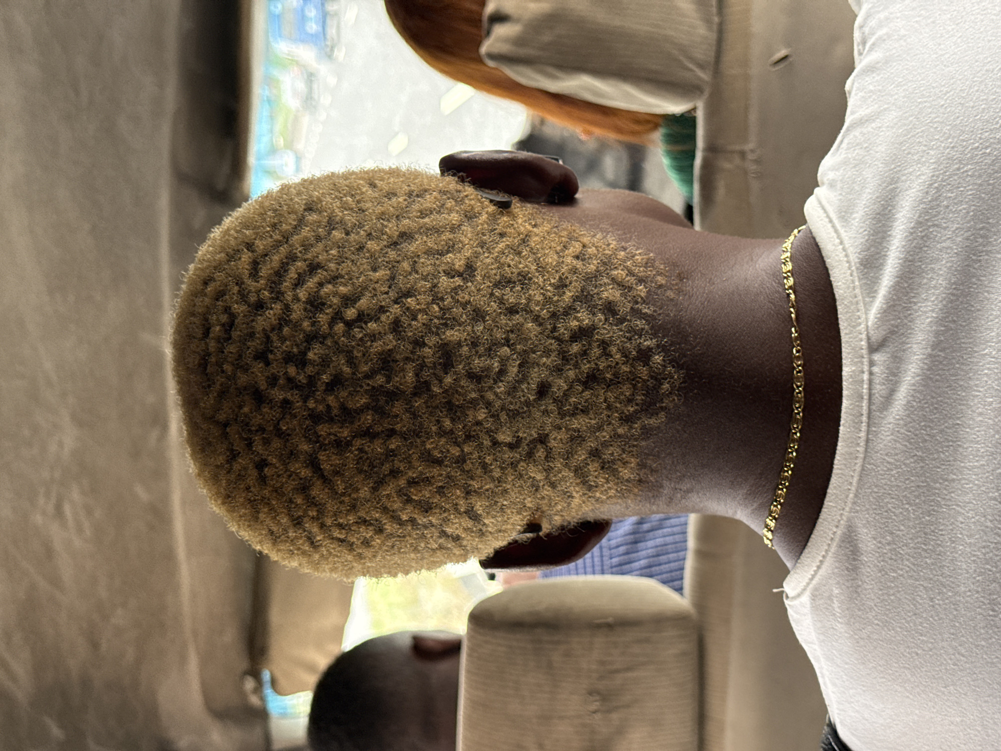 The image presents a forensic view from inside a moving vehicle, located in Ilado, Nigeria. The primary subject is the back of a person's head and upper torso, centrally positioned. This individual has short, tightly coiled hair, bleached blonde from the crown, gradually darkening towards the nape of the neck. A dark skin tone is evident, and a thin, gold-colored chain necklace is worn around the neck, resting on a plain white t-shirt. The right ear, dark brown in color, is visible. To the left, a second passenger is partially visible from behind, exhibiting dark, short hair. This individual is seated in front of a light-colored, upholstered headrest or seat back. Behind this passenger, a blue and white striped fabric is discernable. On the far right, a third passenger is partially obscured by another light-colored seat back, characterized by long, reddish-orange hair and a glimpse of green clothing. Through the vehicle's front windshield, a blurred exterior scene indicates a road or street with other vehicles, including a distinct blue vehicle on the right and white road markings. Green foliage is visible on the left side of the external view. The interior ceiling of the vehicle is light brown and appears to be fabric-lined. No direct actions or interactions are visible between the passengers; all appear to be facing forward.