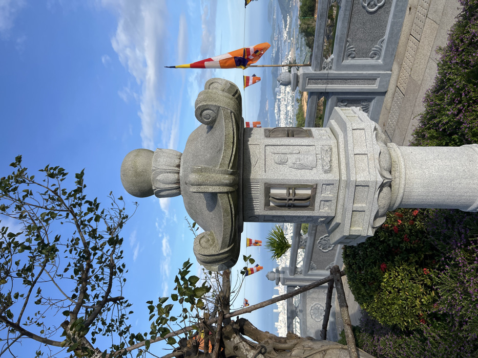This image depicts a panoramic view from an elevated position, identified as being in the city of Diên Khánh, Vietnam. The scene is outdoors under a clear blue sky with scattered white clouds, illuminated by sunlight. In the mid-ground, slightly to the right of the center, stands a multi-tiered, hexagonal stone lantern or stupa, constructed from light grey granite. The lantern features a spherical finial at its apex, below which is a flared element resembling lotus petals. A decorative, tiered roof structure surmounts a hexagonal body. One visible panel on the body displays a carved figure, possibly a Buddhist monk or deity, standing and holding an object. An adjacent panel contains a window-like opening with vertical and horizontal bars. The lantern rests on a fluted, cylindrical column base, which also incorporates lotus petal motifs, emerging from a landscaped bed of green shrubs and small red-flowered plants. To the left of the lantern, the gnarled trunk and branches of a tree, possibly a Bodhi tree, with green leaves, are visible. The tree's lower trunk is supported by several wooden braces. In the background, a stone balustrade with ornate grey panels defines the edge of the elevated area. Beyond the balustrade, a sprawling coastal city with numerous buildings stretches toward a large body of calm, blue water, likely the ocean or a bay. Distant hills and mountains frame the horizon. Strung across the scene, seemingly above the balustrade, are multiple lines of small, rectangular Buddhist prayer flags in traditional colors (blue, white, red, yellow, orange). To the far right, a large Buddhist flag, with vertical stripes of blue, yellow, red, white, and orange, is visible on a pole, extending upwards into the sky. No individuals or specific human actions are depicted in the scene.
