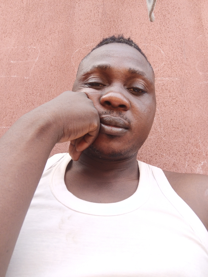 An adult male, appearing to be of African descent, is depicted in a close-up, head-and-shoulders portrait, facing the camera directly. He has short, dark hair and minimal facial stubble. He wears a white, ribbed tank top, exhibiting a faint, light-colored stain on the left chest area. His right hand is closed into a fist, positioned against the right side of his jawline. The subject's expression is neutral, with a direct gaze. The background consists of a uniformly reddish-brown or terracotta-colored textured wall. A faint, irregular light-colored mark is visible on the wall's upper left, and a thin, light-colored object is partially visible hanging from the top edge in the center. The specific location within Doma, Nigeria, is not discernible from the visual evidence.