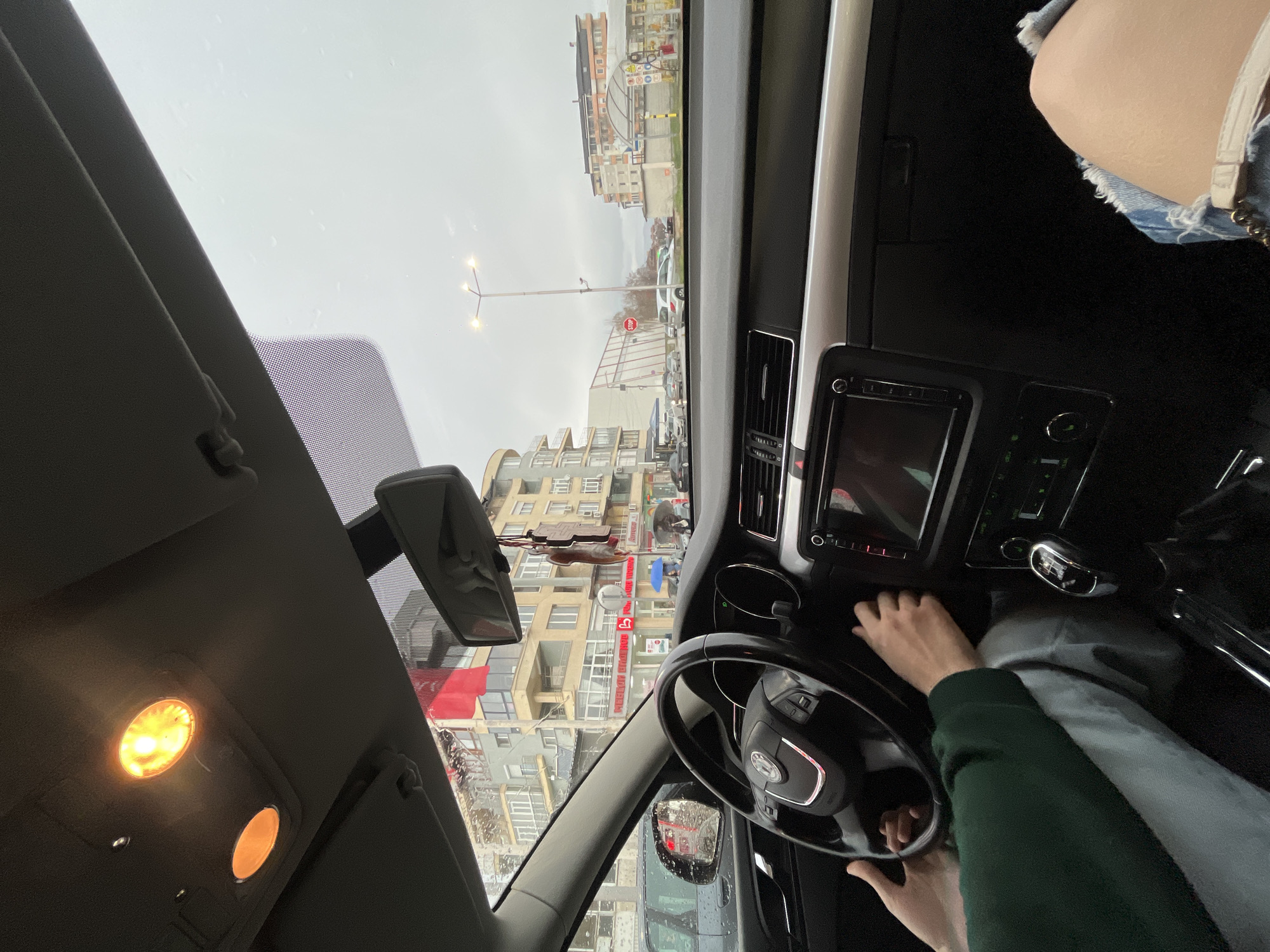 The image presents a forward-facing view from inside a vehicle on an overcast, wet day in Goce Delcev, Bulgaria. The car's interior overhead lights are illuminated. A driver's hands, wearing a dark green long-sleeved garment, are positioned on the steering wheel, which bears a Skoda emblem. The driver also wears light-colored trousers. In the lower right foreground, the upper thigh of a passenger is visible, clad in distressed light blue denim shorts with a white strap. Outside the vehicle, raindrops adhere to the windshield. The urban environment features multi-story buildings lining the street. A large red flag hangs from an upper floor of a building on the left. Commercial storefronts displaying Cyrillic script and a red heart symbol are visible along the building facades. Pedestrians, some holding umbrellas, are present on the sidewalk. Vehicle traffic, including parked and moving cars, occupies the wet roadway. A "STOP" sign is affixed to a pole, and a multi-lamp street light fixture stands centrally. Further down the street on the right, a covered car wash structure is visible.