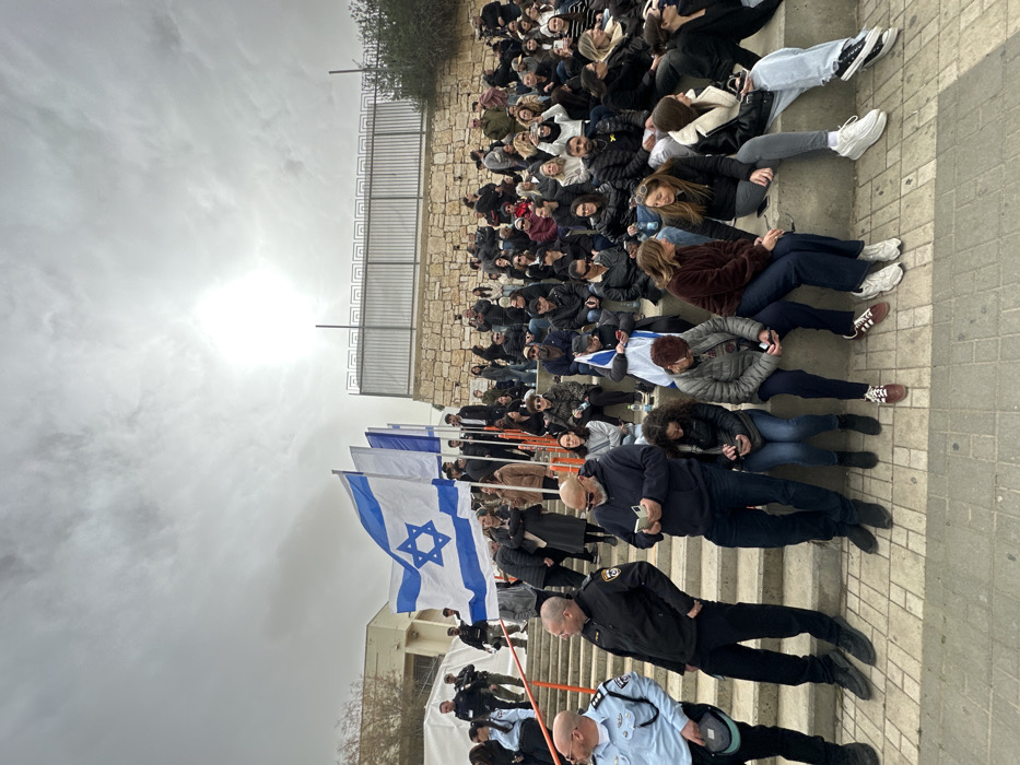 The image captures an outdoor gathering in Meitar, Israel, under an overcast, bright gray sky