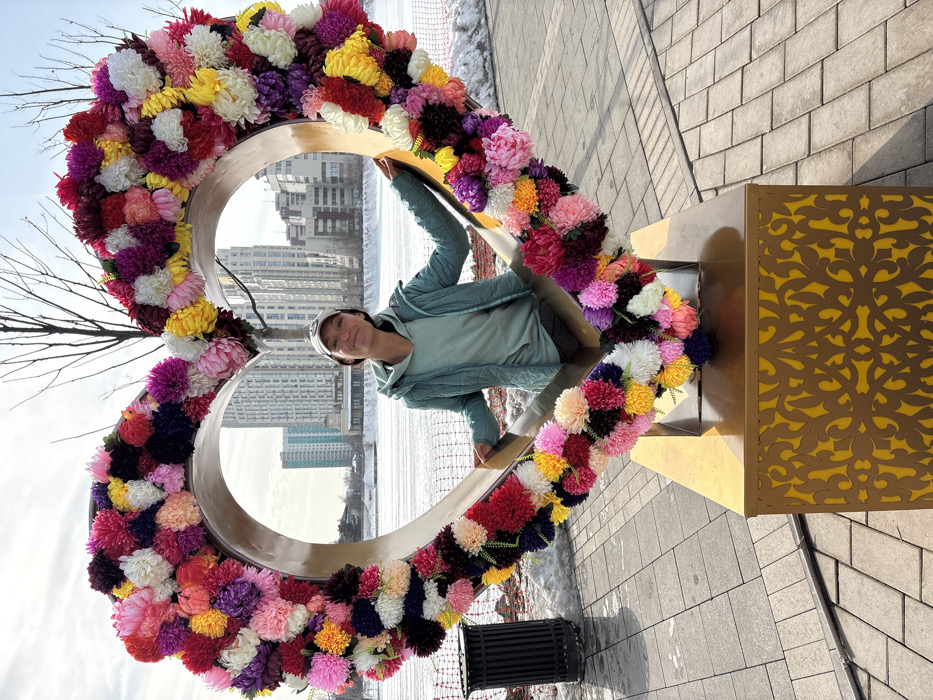 The image presents an outdoor scene in Astana, Kazakhstan, featuring a female subject interacting with a decorative floral archway