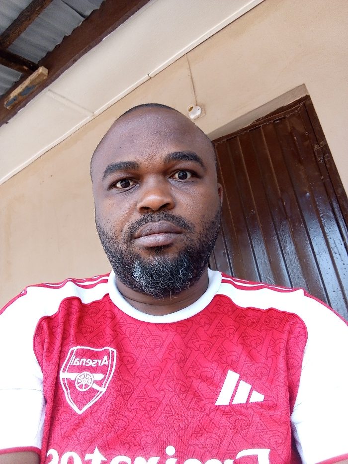 An adult male subject is depicted in a medium shot within Sabon Tasha, Nigeria. He has a dark complexion, a bald head, and a dark beard with visible graying strands, particularly on the chin. His dark eyes are open and directed forward, engaging the viewer. The subject is wearing a red, short-sleeved football jersey with white accents on the shoulders and sleeves. The jersey displays a white Arsenal crest on the left chest, a white Adidas logo on the right chest, and the "Emirates Fly Better" sponsor text is partially visible across the lower chest. The red fabric of the jersey features a repeating, subtle pattern. The background consists of a light beige-colored wall. To the subject's upper left, a white horizontal trim board is visible, above which a corrugated metal roof and a rough wooden beam are present. To the subject's upper right, a white electrical light fixture is mounted on the wall adjacent to a dark brown wooden door with vertical paneling.