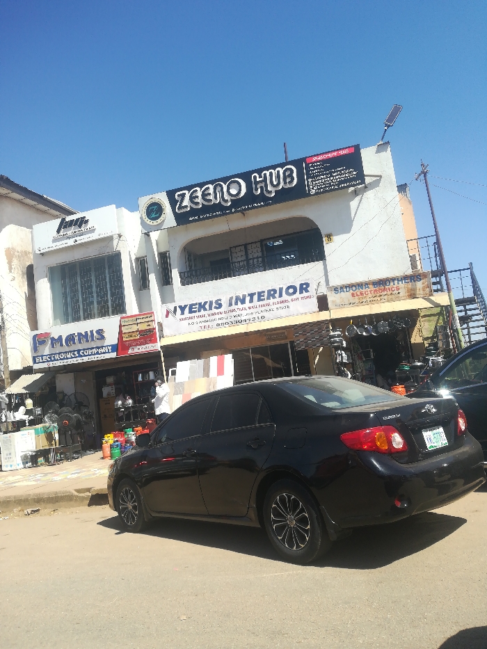 This image captures a street-level view of a commercial area in Jos, Plateau State, Nigeria, specifically at 20 J.B Akanbiku New Way, as indicated by signage. The scene is illuminated by bright daylight under a clear blue sky. In the foreground, a black Toyota Corolla sedan is parked, facing away from the viewer at a slight angle. The vehicle has tinted windows and distinctive black and white multi-spoke rims. Its Nigerian license plate, "AK 573 KJ," is clearly visible on the rear. Part of another dark-colored vehicle is visible behind the Toyota on the right. The background features a multi-story building with a white facade, housing several businesses. On the ground floor, from left to right: * **FMANIS ELECTRONICS COMPANY:** Identified by a red and white sign. The shop displays various electronic items and appliances outside, including several standing fans, blenders, and multiple colored gas cylinders (red, orange, green, blue). An adult male in a white shirt is visible near the shop's entrance. * **NYEKIS INTERIOR:** Situated centrally, with a white sign displaying its name and services such as "SANISTONE, WINDOW BLIND, TILES, WALL FRAME, FLOWERS, GIFT ITEMS." The address "20 J.B AKANBIKU NEW WAY, JOS PLATEAU STATE" and phone number "TEL: 08033049310" are also present on this sign. Display tiles or panels are visible near its entrance. * **SADUNA BROTHERS ELECTRONICS:** Located to the right, beneath an external metal staircase, identified by a brown sign. Various cooking pots and utensils are displayed on a rack outside this shop. On the upper level of the building, a large black sign with white lettering prominently displays "ZEENO HUB" along with a circular "Z" logo. This sign also lists services including "Solar & Inverter Installation," "CCTV Installation," "Car Tracking," and "Laptop & Desktop Repair," among others, with a phone number (07065609090). A smaller, partially visible sign for "JAY..." is to the left of Zeeno Hub. A solar-powered street light fixture is mounted on the top right corner of the building. A wooden utility pole with electrical wires extends vertically on the far right. Shadows from the building and parked cars are visible on the paved street.