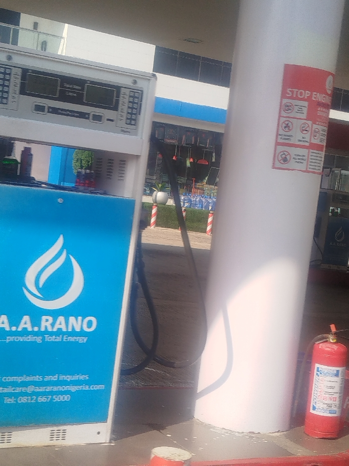 The image depicts a partial view of an A.A. RANO fuel station forecourt, likely located in Aso, Nigeria. In the left foreground, a white and blue A.A. RANO branded fuel dispenser is visible, featuring digital displays, keypads, and a black fuel hose. The blue panel prominently displays the company logo, "A.A. RANO ...providing Total Energy," along with contact information including an email address ending in "@aaranonigeria.com" and a Nigerian phone number, 0812 667 5000. To the right, a large white cylindrical support pillar stands, bearing a red and white safety sign with "STOP ENGINE" at the top and multiple graphic warnings, including prohibitions against open flames, smoking, and mobile phone use. A red portable fire extinguisher is positioned at the base of this pillar. The ground is paved, and red and white striped bollards are visible in the midground. Beyond these, rows of blue plastic water bottles and some potted green plants are arranged. A building with white and blue architectural elements forms the background. The scene is brightly illuminated by sunlight, casting shadows. No individuals are present in the frame, and no specific actions or interactions are depicted.