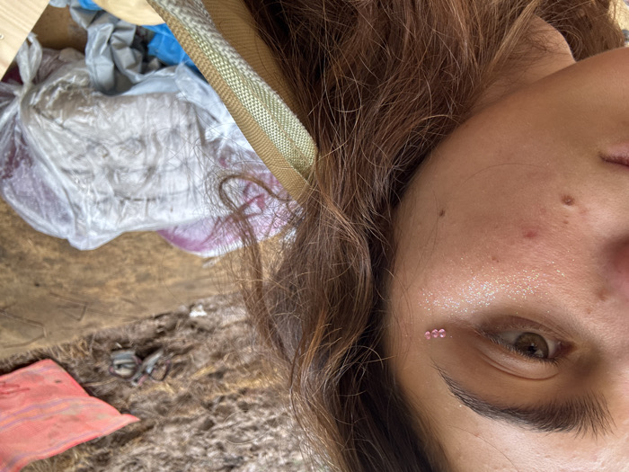 A close-up, slightly rotated, photo shows a woman’s face with brown hair. She has glitter on her forehead and three small pink gems above her eye. Her complexion is fair. In the background, there is a bag of crumpled plastic, a wooden surface, and a small red cloth. The photo appears to be taken indoors, with a focus on the woman's face and artistic makeup.