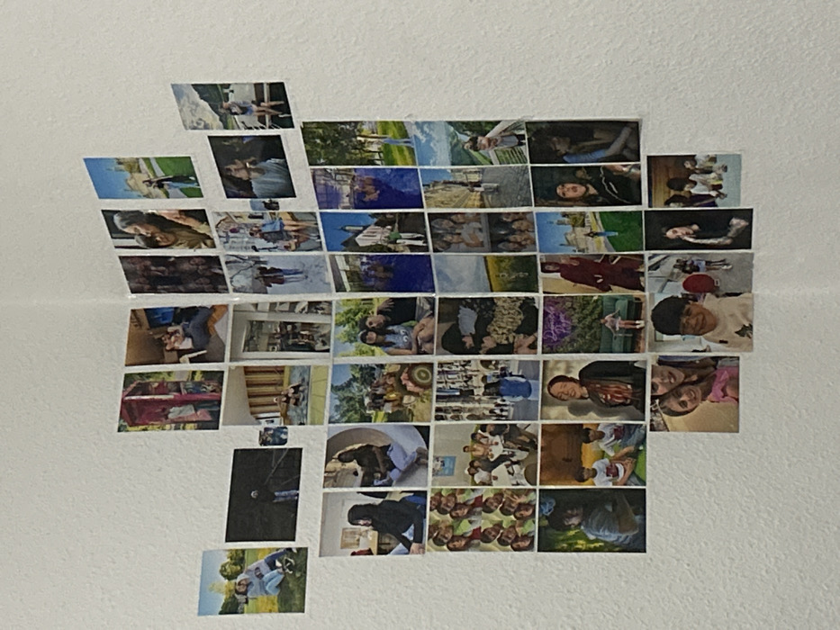 The image depicts a wall collage composed of approximately 40-50 small, unframed color photographs affixed directly to a textured, off-white interior wall