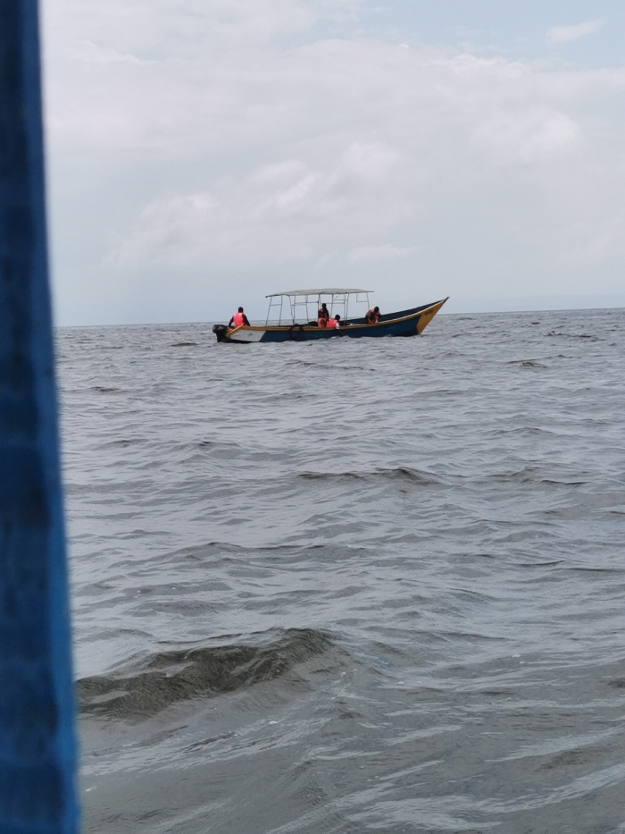 The image displays a utility boat on a body of water, identified as Lake Victoria near Kisumu, Kenya. The boat, featuring a light blue hull with a yellow section at the bow, is equipped with an outboard motor at its stern and an open-sided canopy covering its central portion. Four individuals are visible within the boat, each wearing a bright orange life jacket. One person is positioned near the stern, while the other three are seated forward under the canopy. The water exhibits moderate rippling under an overcast sky. A dark blue vertical element, likely part of the viewing vessel, partially obstructs the left side of the frame. Distant land is faintly visible on the horizon to the right.