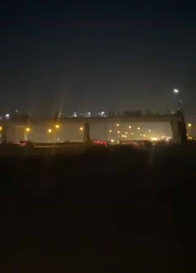 n overpass with people standing on the top. The view is from below, at night, and traffic moves underneath the bridge. Street lights illuminate the road and people. There is the sound of a car horn.