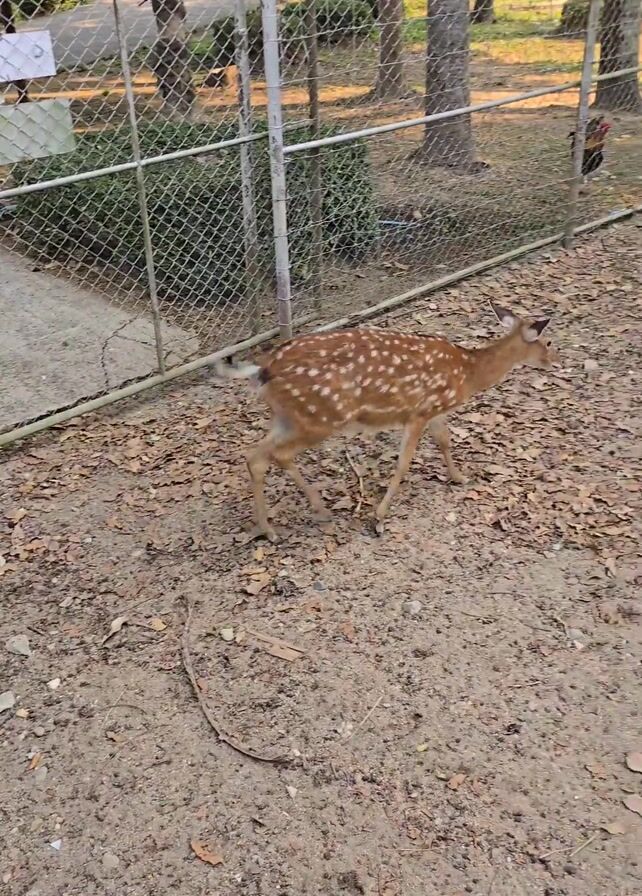 small, spotted deer walking in an enclosure. The enclosure is surrounded by a chain-link fence and filled with fallen leaves. In the background, there are trees and other deer resting on the ground. A rooster is seen walking around in the enclosure. The video is shot in natural light, suggesting it is daytime.