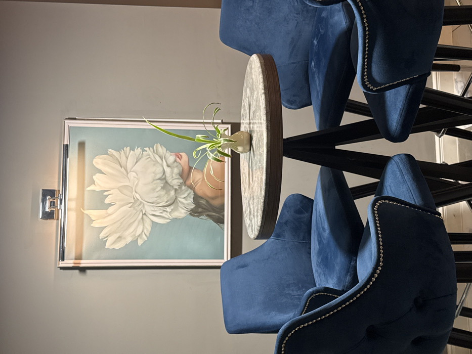 An interior scene in Kranevo, Bulgaria, displays a seating arrangement against a neutral-toned wall. Centered on the wall is a framed artwork, illuminated by a chrome picture light mounted above it. The artwork depicts a stylized female profile facing right, with her head obscured by a large, white, feathery floral arrangement. Her hair is dark, and only her chin, neck, and part of her shoulder are visible, along with her red lips. Directly below the artwork, four dark blue velvet upholstered chairs with high backs are arranged around a small, round table. The chairs feature visible stud detailing along the edges of some armrests and backs. The table has a polished, light-colored, marble-patterned circular top and a dark, angular pedestal base. A small, cream-colored ceramic vase containing a green plant with slender leaves is placed in the center of the table. No individuals are present in the image.