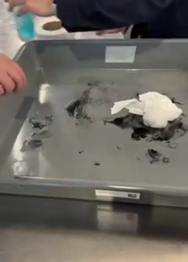 person in a navy blue blazer and light blue shirt cleaning a gray security tray with a white tissue. The person first places a bottle of blue liquid in the tray and then uses the tissue to wipe up black residue from the tray's surface. The scene appears to be at an airport security checkpoint, given the presence of the security tray and the person's uniform. In the background, there's a plastic bag containing items, including a roll of toilet paper. The tray itself has a barcode sticker on it.