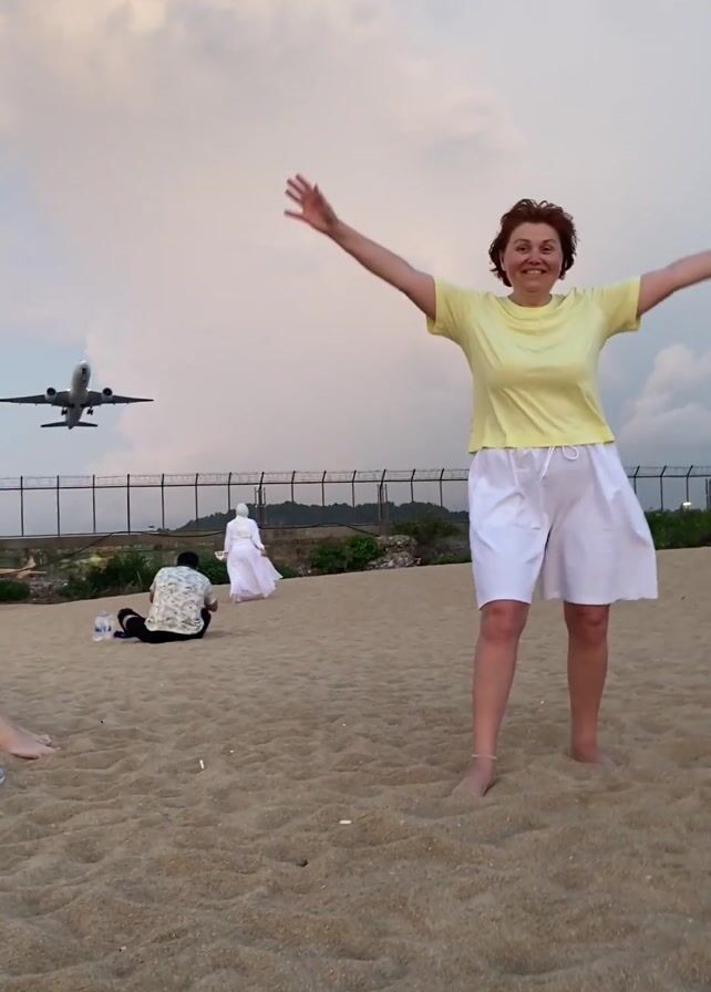 A woman in a yellow t-shirt and white shorts stands barefoot on a beach, with her arms raised and a big smile as a large airplane flies low overhead. In the background are other people, some sitting on the sand and one wearing a white robe, as well as a fence separating the beach from what appears to be an airport area. The sky is cloudy, and the overall scene seems to capture a moment of excitement or joy as the plane passes close by.