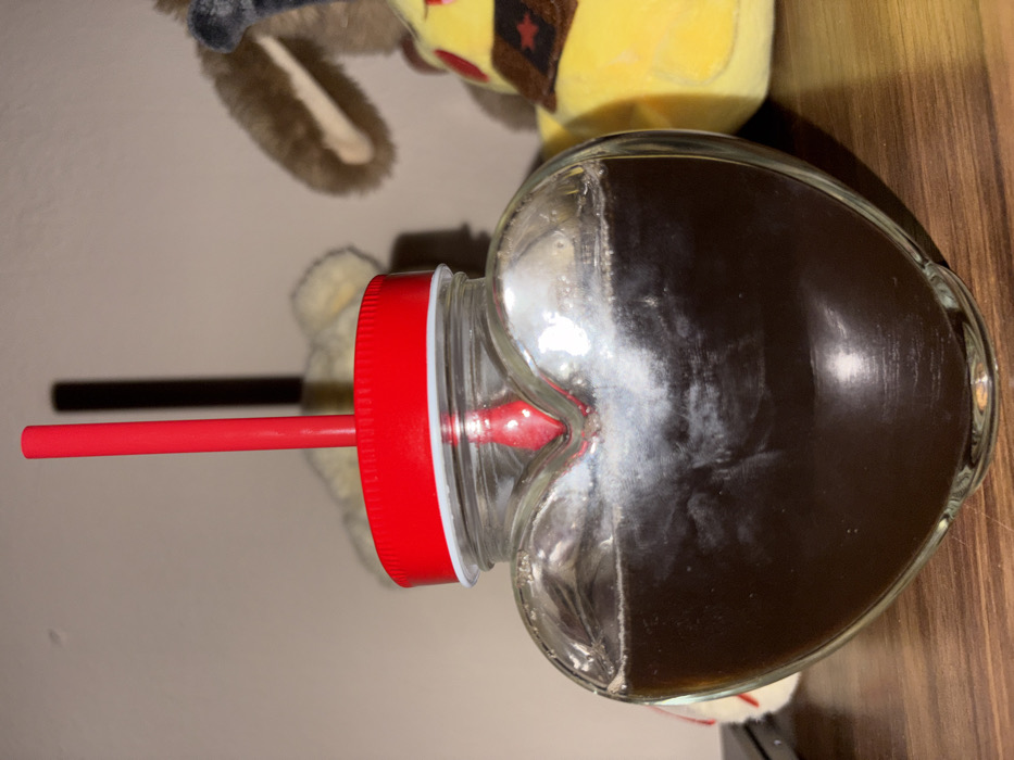 An indoor scene in the city of Sadovo, Bulgaria, depicts a clear, heart-shaped glass jar resting on a brown, horizontally-grained wooden surface. The jar contains a dark, opaque liquid, filling approximately two-thirds of its volume. White, frothy residue or streaks are visible adhering to the inner glass surface, particularly near the liquid's meniscus. The jar is topped with a red screw-on lid, which features a white inner rim and a central opening from which a red plastic straw extends vertically upwards. In the blurred background, several plush toys are visible. To the right of the jar, a yellow plush toy, identifiable as a Pikachu, is present, featuring a dark brown sash with a red star. Partially obscured behind the jar are elements of other plush toys, including a brown ear belonging to one and a light-colored, possibly cream-toned, fuzzy texture from another. The background above the toys consists of a plain, light-colored wall, onto which a dark, vertical shadow of the red straw is cast, indicating a light source from the foreground or left.