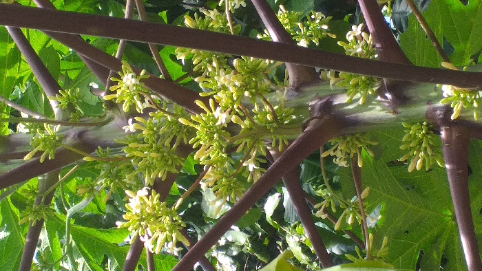 A close-up, vertical photograph depicts the blossoming trunk and branches of a papaya tree (Carica papaya) in Mns Alue, Indonesia