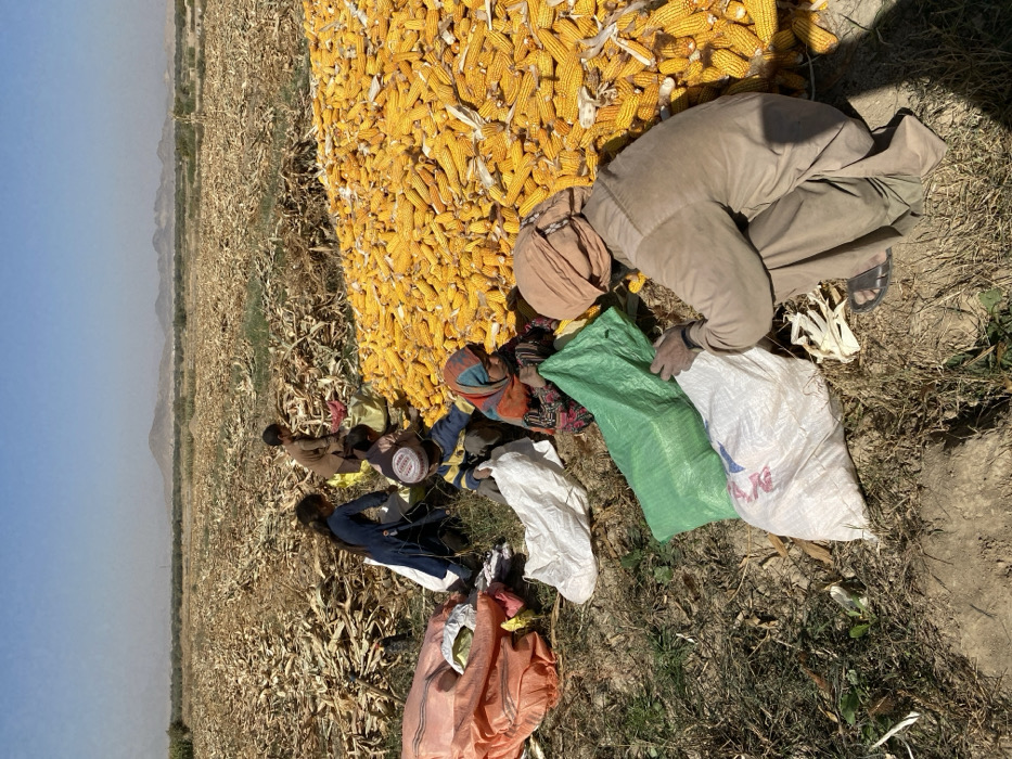 The image displays an open-air agricultural scene under a clear, bright blue sky in a rural, arid region characterized by distant low-lying mountains. A group of six individuals, predominantly children, are engaged in post-harvest activities. In the mid-ground, a large, organized pile of husked yellow corn cobs dominates the right side of the frame. In the foreground, an adult or older individual, wearing light brown clothing and a matching head covering, is crouched, attending to a green and a white woven sack placed on the dry, sparsely vegetated ground. Several children, dressed in various traditional garments, are positioned around the corn pile and other bags (including an orange-pink and a white sack), actively gathering or packaging the corn. The expansive background consists of a recently harvested field, strewn with dry corn stalks or crop residue, extending towards the mountainous horizon.