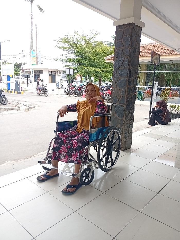 An elderly woman sits in a wheelchair, positioned on a tiled walkway next to a stone pillar. She wears a mustard-colored top, a floral skirt, and sandals. In the background, there is a street scene with parked motorcycles and other vehicles. A person wearing a hijab is seated on the walkway, further away from the woman in the wheelchair. The setting appears to be outside a building or hospital, judging by the structure of the pillar and the surrounding environment.