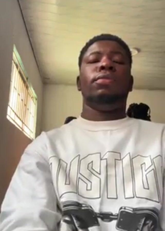 A medium shot captures a young, dark-skinned man wearing a white, long-sleeved shirt with a "JUSTICE" graphic featuring an image of handcuffs