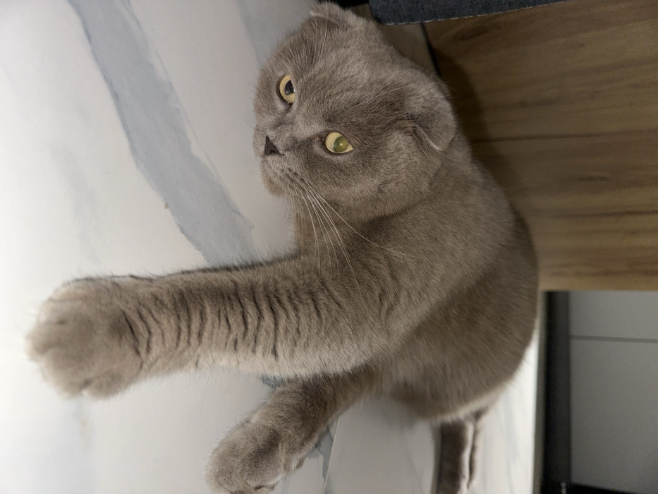 - "An adult Scottish Fold cat with lilac-grey fur and yellow-green eyes is depicted lying on its left side on a light-colored tiled floor with subtle grey marbling" by FM-83v1j2, licensed under CC BY 4.0