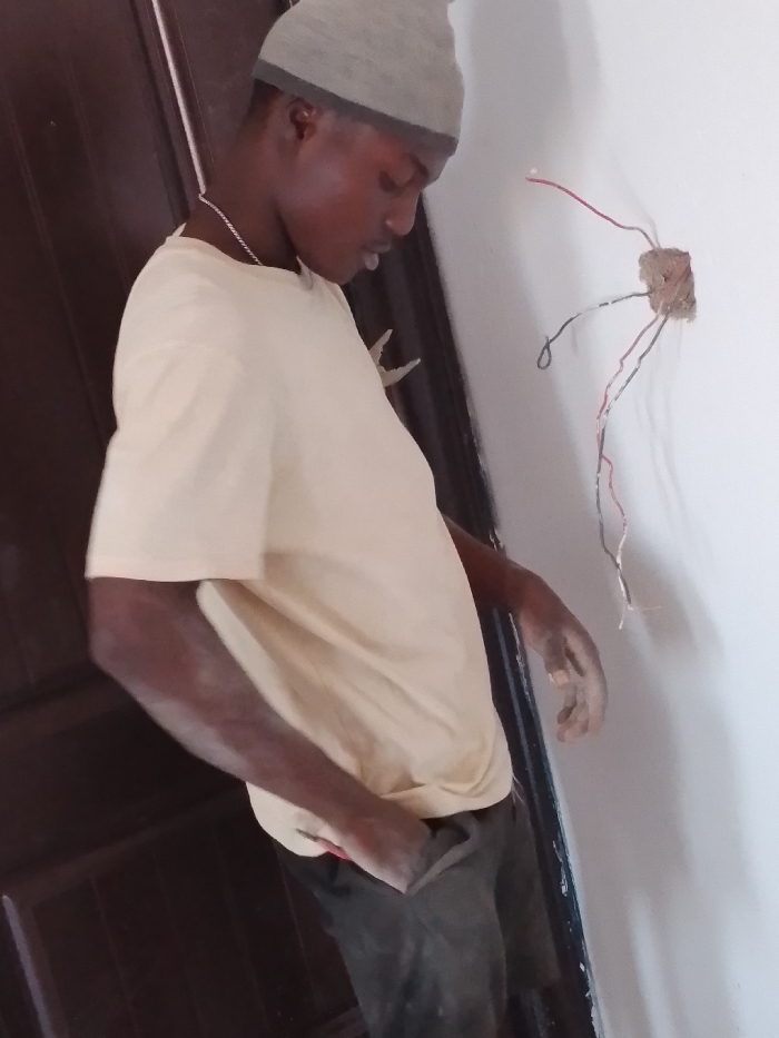 An interior scene in Bar Gada, Nigeria, depicts a male individual standing near a white wall and a dark wooden door frame. The individual wears a light grey beanie, a light yellow short-sleeved t-shirt, and dark trousers, with a silver chain visible around his neck. His hands and forearms show signs of dust or dirt. He is looking downwards, with his right hand in his pocket, partially revealing a red-handled tool. To his right, an irregularly shaped opening in the white wall exposes multiple electrical wires (red, black, and white/grey). The setting indicates a construction or renovation environment.