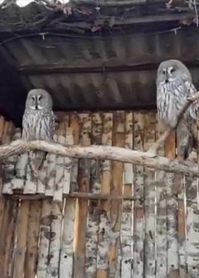 two Great Grey Owls perched on a branch inside a wooden enclosure
