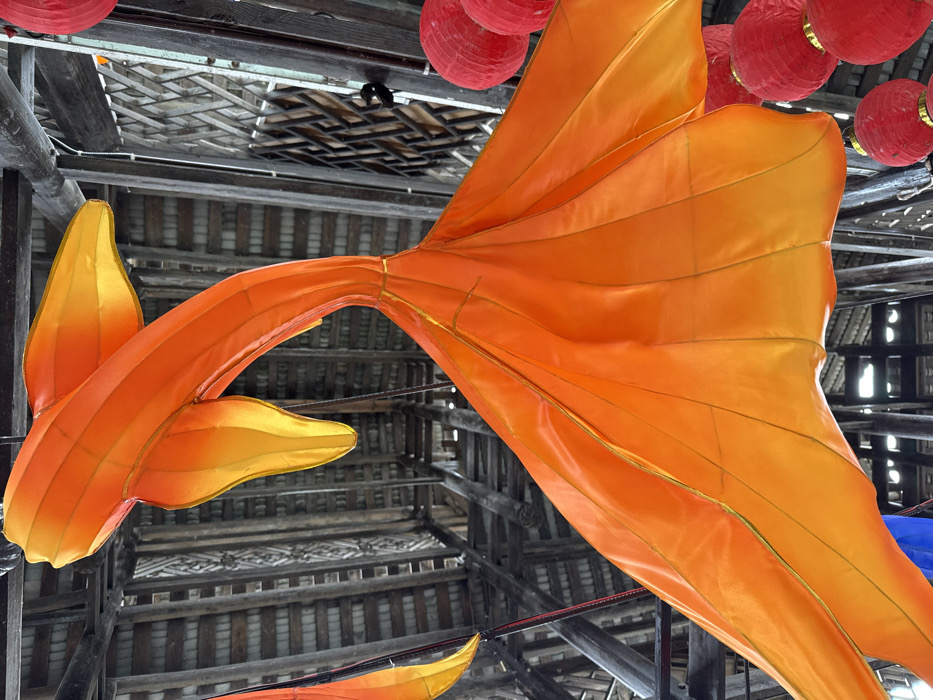 The image depicts a large, ornate, fabric lantern shaped like a stylized orange and yellow fish, hanging from a traditional wooden ceiling in Furong, China