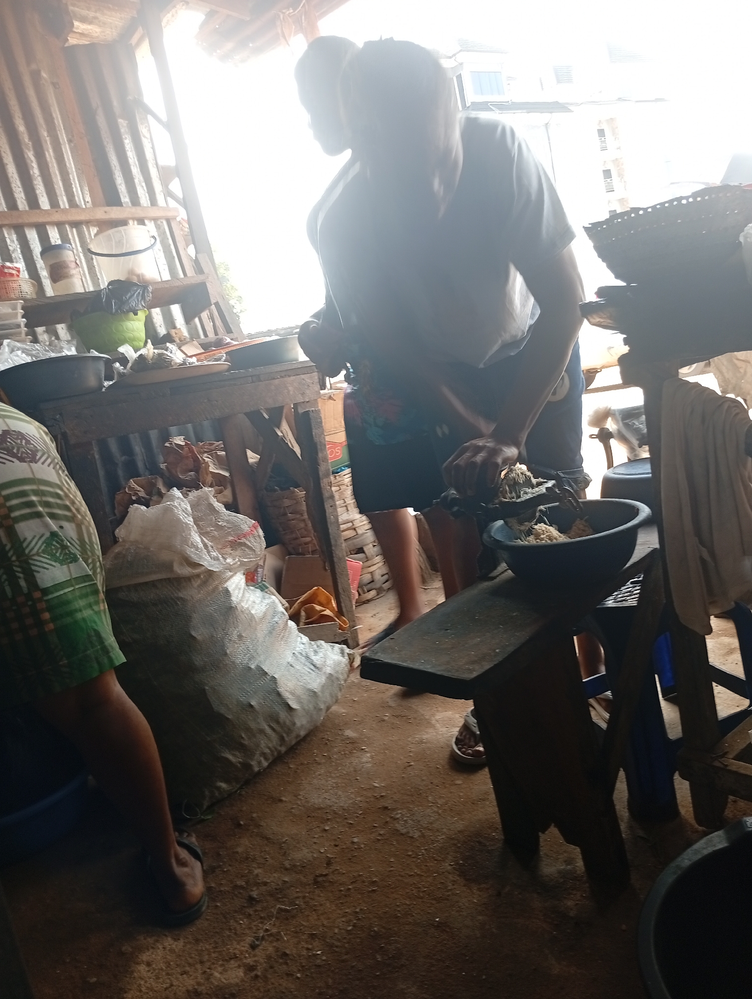 scene in what appears to be a small-scale food processing or preparation area, possibly in the city of Owerri, Nigeria