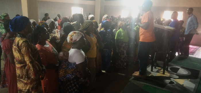 An indoor scene in Kafanchan A, Nigeria, depicts a large gathering primarily of adult women