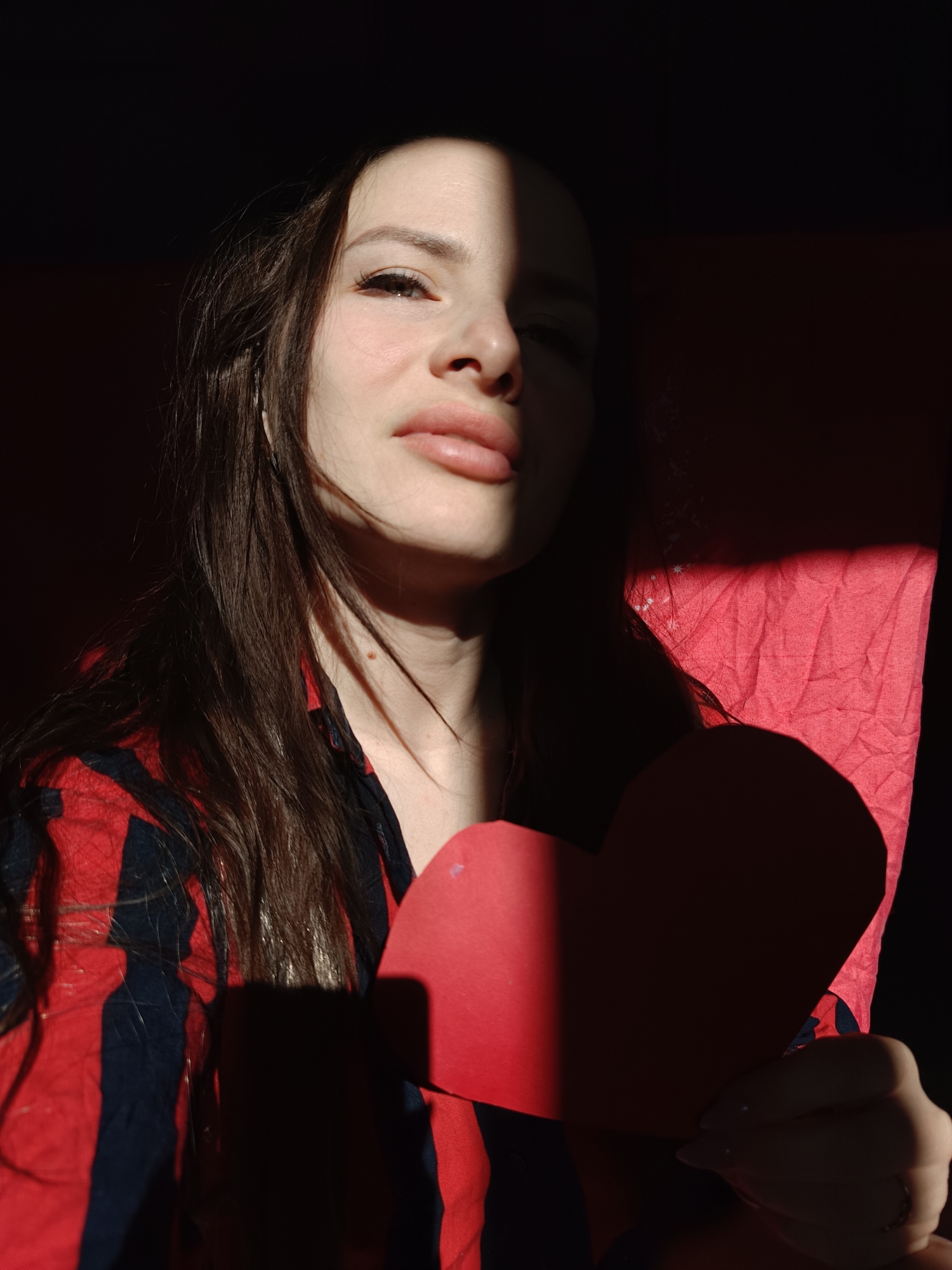 A young woman is holding a red heart-shaped object in her right hand. She is partially lit by strong sunlight, casting a shadow vertically across her face. She has long dark hair and is wearing a red and dark blue striped shirt. The background appears to be a red surface, possibly fabric. The location is unknown.
