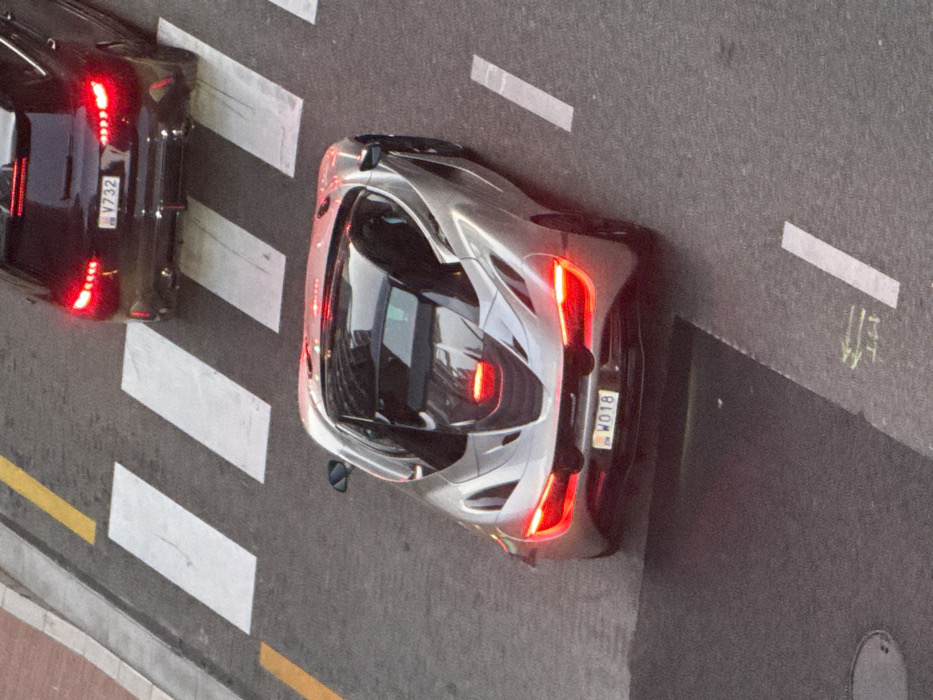 An aerial shot captures two cars at a crosswalk. A silver sports car is on the right with illuminated red taillights and license plate "W018." To the left, a darker car is partially visible, also with taillights illuminated and license plate "V732." The crosswalk has white stripes bordered by a yellow stripe on one side. The street surface appears to be asphalt.