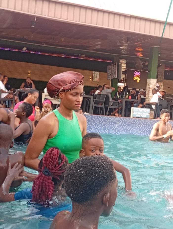A group of people, including children and adults, are gathered in a swimming pool. The water is bright blue and looks refreshing. In the center stands a woman with a brown head covering and a green top, seemingly overseeing the group. Behind them is a bar with people sitting at tables, and a sign that says "Cocktails Only." An "Attention" sign is posted near the edge of the pool.