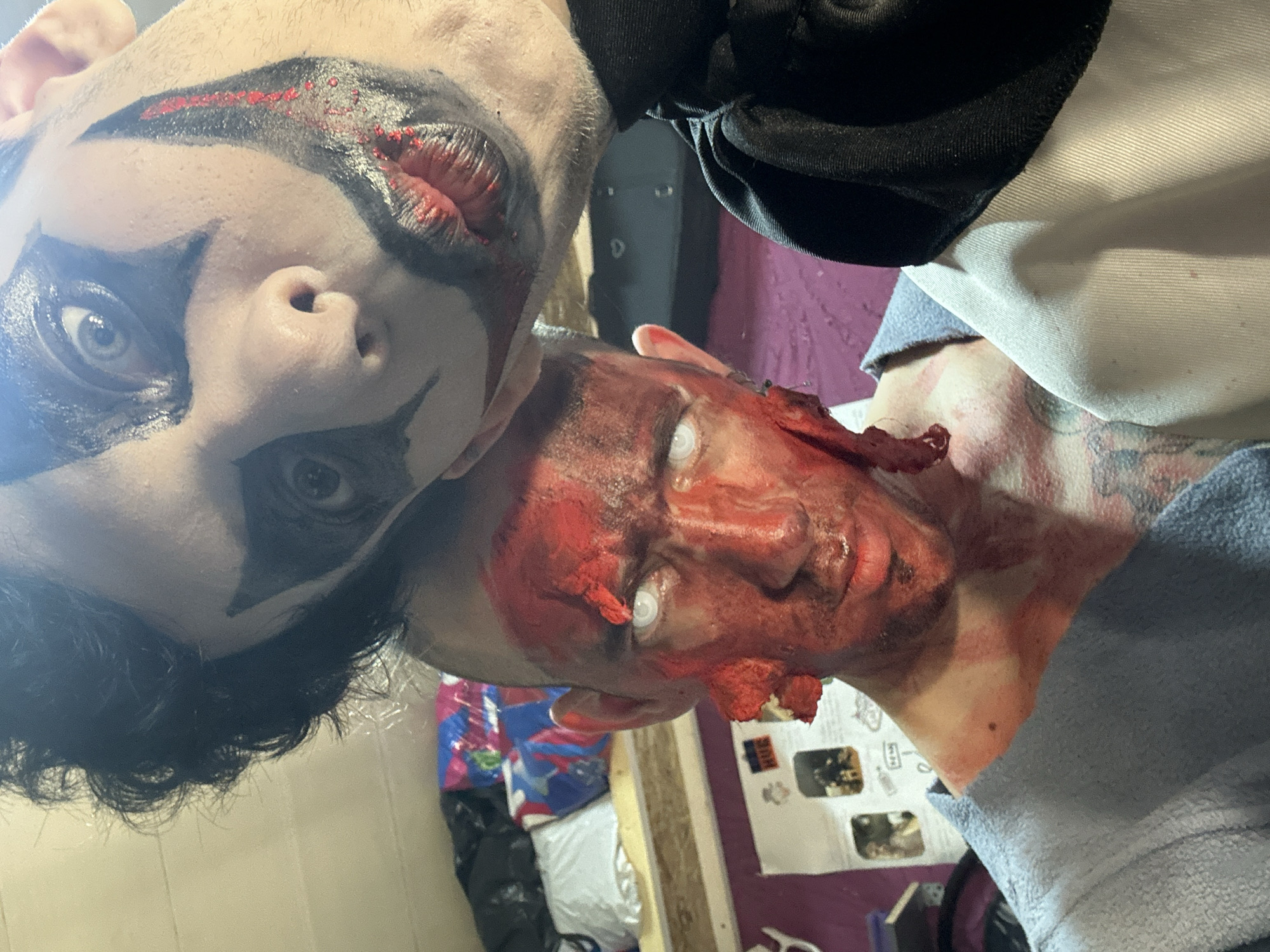 Two people are in the frame. The person on the left has clown makeup, predominantly black and red around the eyes and mouth. The person on the right has makeup that simulates bloody injuries, with white contact lenses. The background shows a cluttered room with various items. There is no indication of the image being taken in Saratov, Russia.
