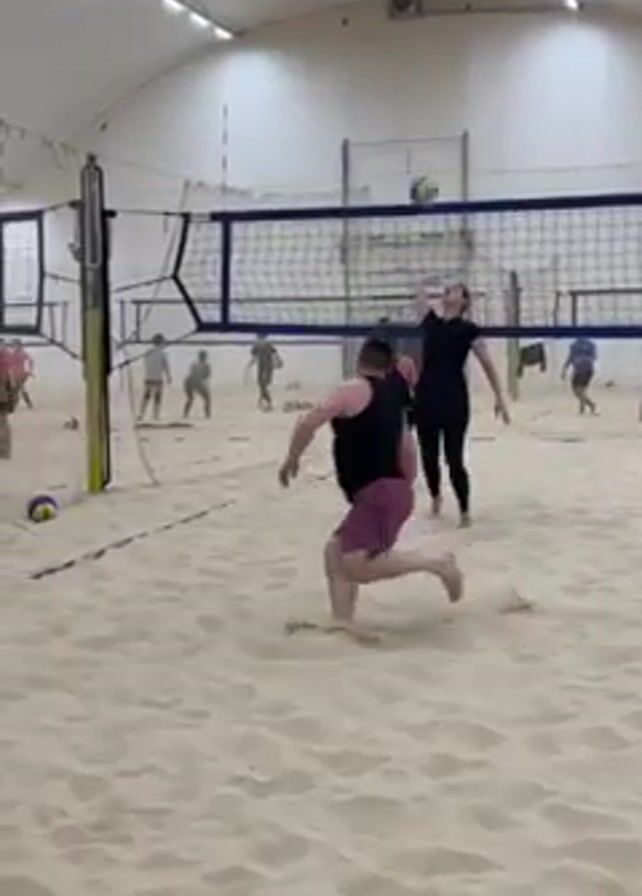 group playing beach volleyball indoors. Players of diverse sizes and clothing stand or move around a sandy court with a net. A woman in black serves the ball. A man in a black tank top and purple shorts kneels, bumps the ball, then falls onto the sand. Other players watch or prepare for the next play. The indoor arena is well-lit with a high, arched ceiling.