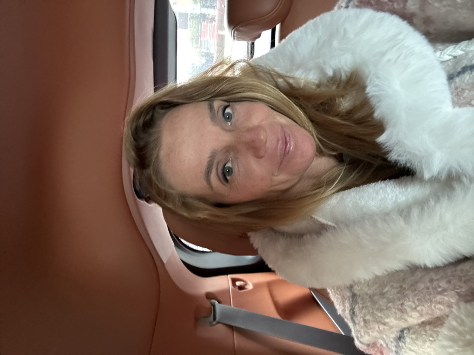 single Caucasian woman seated inside the passenger compartment of a vehicle, likely in the backseat