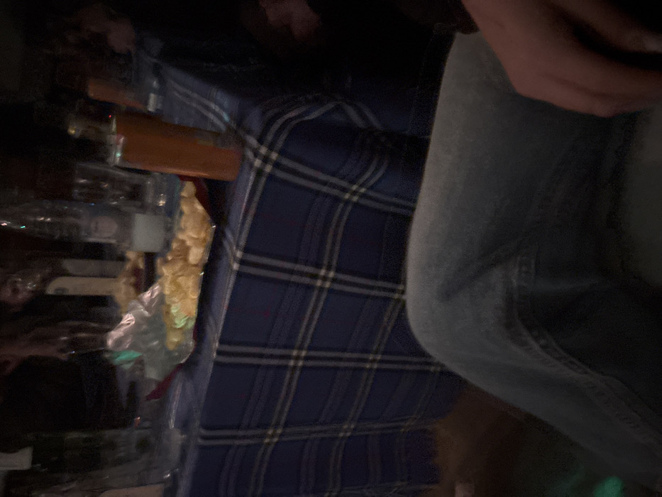 The scene is set indoors at a social gathering in Trakiets, Bulgaria, under dim lighting conditions. The foreground reveals the upper legs of an individual wearing light blue denim jeans, with a hand partially visible resting on the right thigh. A table, draped with a blue and white plaid tablecloth, occupies the mid-ground. On the table, a transparent plastic bag containing light-colored potato chips or crisps is centrally positioned on a dark, shallow tray. To the left of the chips are several clear glass bottles and empty glasses. To the right, an orange cylindrical object, consistent with a beverage can or bottle, stands upright. The background is blurred and dark, showing indistinct human figures and shapes, indicating the presence of multiple individuals at the event. No overt actions or interactions are clearly depicted.