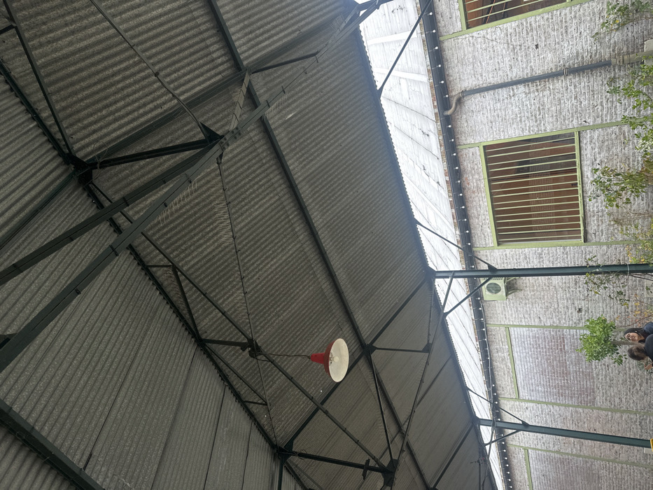 The scene depicts an interior view of a large, covered space identified as the Halle Secrétan, located in the 19th arrondissement of Paris, France. The dominant feature is a high, corrugated metal roof supported by an exposed dark green metal truss system. Anti-pigeon spikes are visible along some of the roof beams. A single, unlit red industrial-style pendant lamp with a white interior hangs centrally from the roof structure. Below the roofline, a light grey, whitewashed brick wall forms the background, exhibiting areas of wear and some exposed red brick. This wall features several large, rectangular sections framed in a muted green color; one on the right contains vertical bars, resembling a window or vent, while a similar section to the left appears bricked or covered. An external air conditioning unit is mounted on the brick wall to the left of the barred window. A dark downspout runs vertically along the wall to the right of the barred window. Along the top edge of the background building, a string of small white decorative lights is visible. Various potted plants and small green bushes are arranged at the base of the wall. In the lower-left foreground, two individuals are partially visible, conversing with each other. One person, a woman with dark hair, is seen smiling towards the other. The lighting suggests an overcast day, providing diffuse natural light into the space.