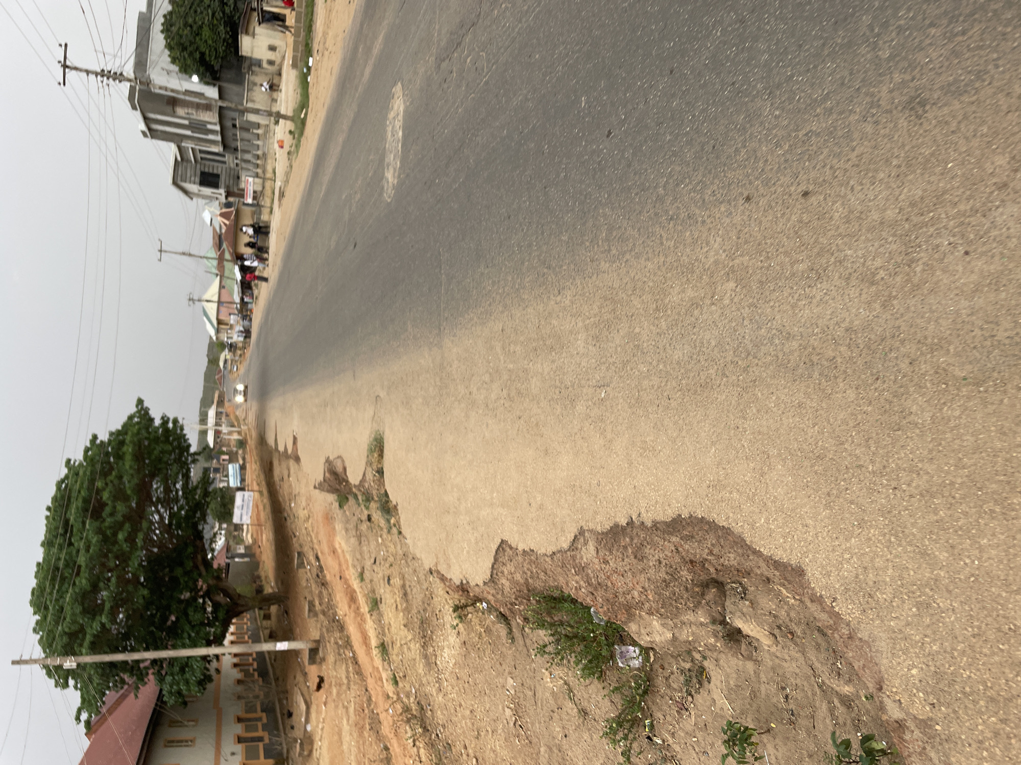 street in Jos, Nigeria. The road is paved but in disrepair, with significant erosion along the edges. Buildings and a tree are visible on the left side of the road. Power lines run alongside the road. People are standing near the buildings in the distance. The sky is overcast.