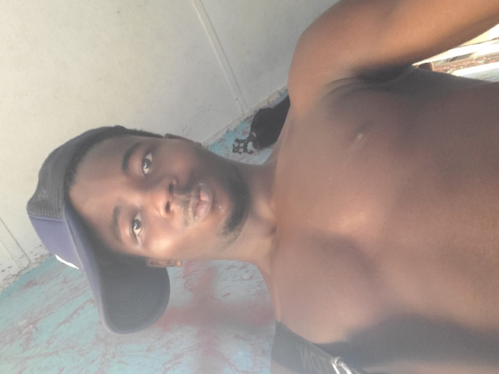 A close-up, eye-level photograph captures a shirtless adult male posing indoors. The individual has dark skin, short dark hair, and light facial stubble, including a goatee. He wears a navy blue baseball cap with a black mesh back, positioned backward on his head. His lips are pursed in a "duck face" expression, and his eyes are open, looking directly into the camera. A black strap, possibly from a bag or harness, is visible over his left shoulder. The background consists of a distressed light blue/aqua wall with darker marks and faint red/pinkish graffiti-like elements. An off-white ceiling or upper wall section is visible in the upper right quadrant. The scene is brightly lit, causing some glare on the subject's forehead and cheeks. The specific location is an unidentified indoor setting within the city of Unknown, Unknown.