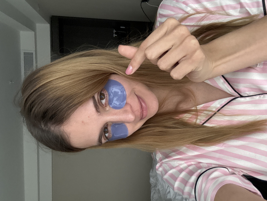 A woman with light brown hair poses in a pink and white striped pajama top. She wears blue under-eye patches. Her hand, with pink nail polish, forms a finger heart. A dark rectangle hangs on the wall behind her. A vent is visible to the left, and rumpled white bedding is in the lower corner.
