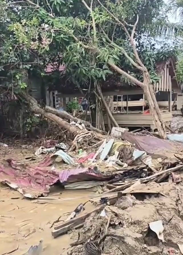 aftermath of a flood. Mud and debris cover the ground around houses. There are pieces of metal, wood, and other building materials scattered everywhere. A tree lies uprooted next to one house. Laundry hangs on a line outside another house. The scene is one of devastation.