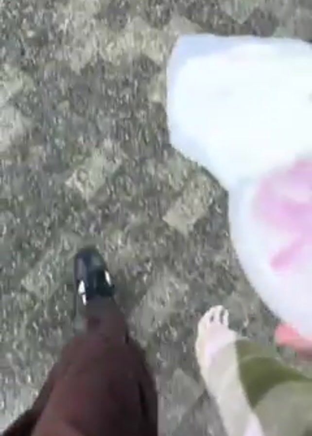 A person is seen from the waist down walking on a herringbone-patterned brick or stone surface. The person is wearing dark shoes, dark pants, and a light green and white scarf or shawl. The camera view is from above and moves with the person walking.