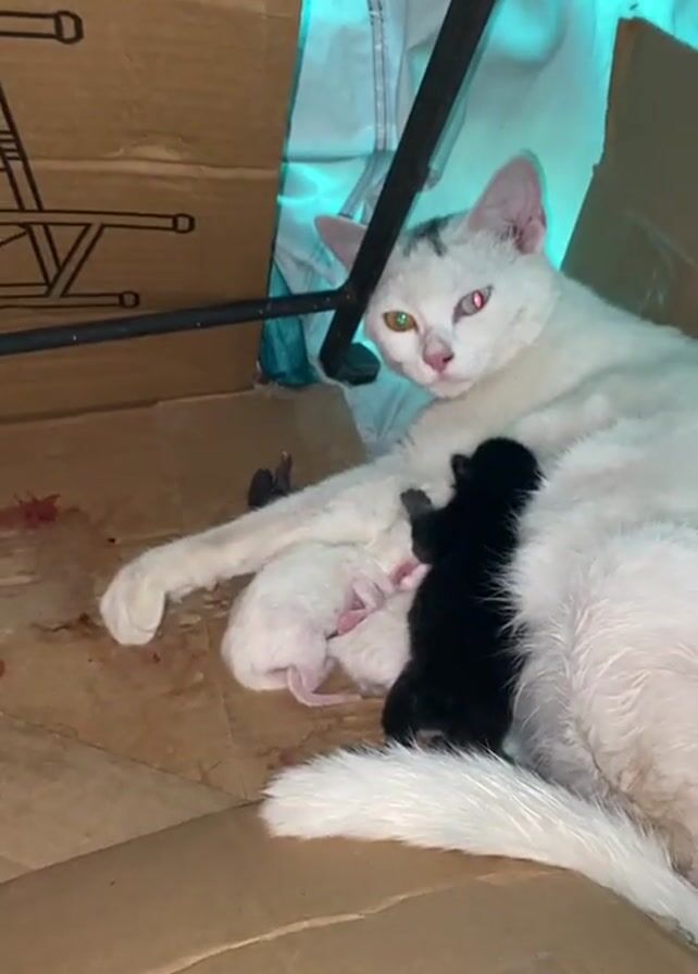 A close-up shot shows a white cat lying in a cardboard box with her newborn kittens. The cat has heterochromia; one eye is yellow, and the other is red. There appear to be at least two kittens, one white and one black, nursing from the cat. The box is partially obscured by what seems to be a table leg and a piece of fabric, likely providing a makeshift shelter. The scene has a domestic feel, capturing a private moment between the mother cat and her young.