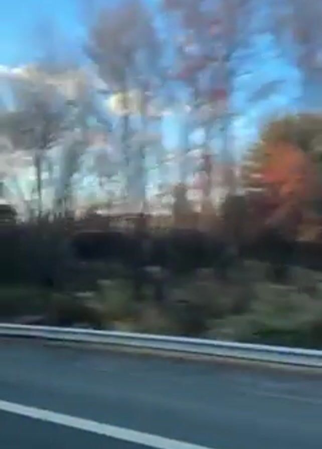 view from a moving vehicle on a highway. On the right side of the road is a metal guardrail. Beyond the guardrail is a landscape consisting of trees, shrubs, and some fields. The sky is blue with scattered clouds. The camera appears to be inside a vehicle, recording the passing scenery. An overpass structure is also seen briefly passing by.