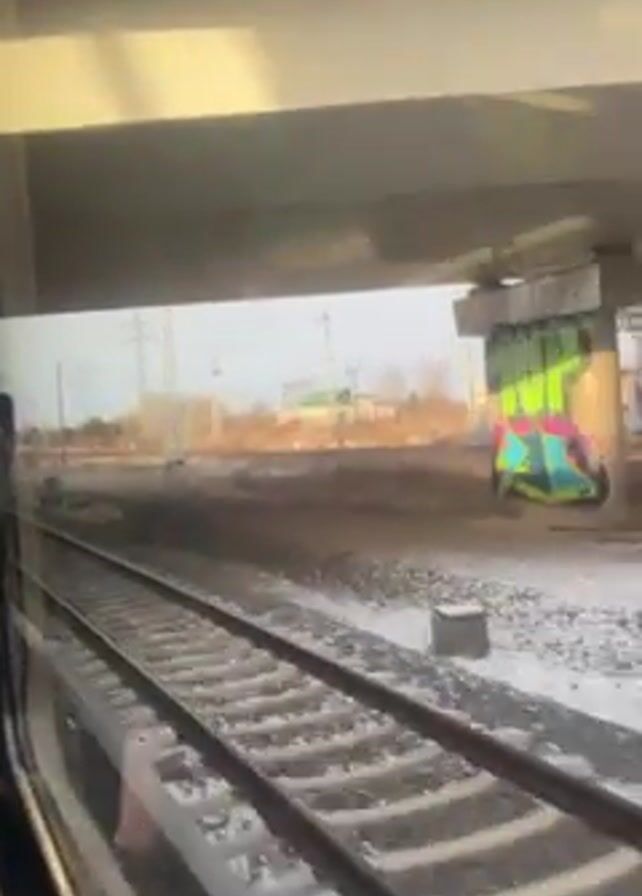 view from the window of a moving train. The camera is angled to the right, focusing on the scenery passing by. The foreground is dominated by the train tracks, with the metal rails prominently visible. Beyond the tracks, the landscape appears industrial, with patches of bare earth and some vegetation. There are metal structures and electrical equipment in the distance. As the train moves, the perspective shifts to show a concrete overpass above the tracks. The overpass is supported by pillars, some of which are covered in graffiti. The lighting is somewhat muted, suggesting an overcast day. The overall impression is of a train journey through a somewhat neglected industrial area.