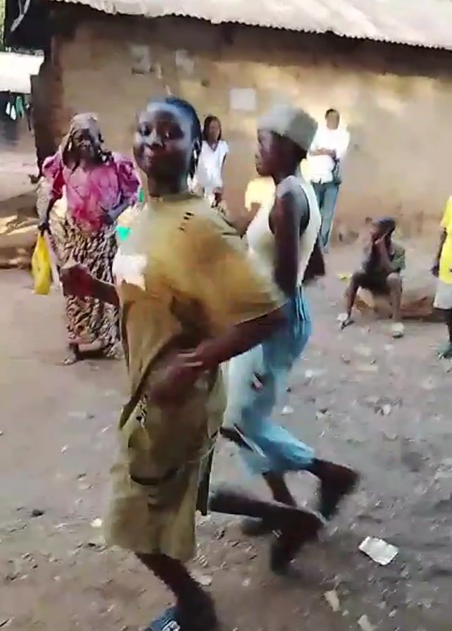 several children and adults participating in a dance in an outdoor area that appears to be a village
